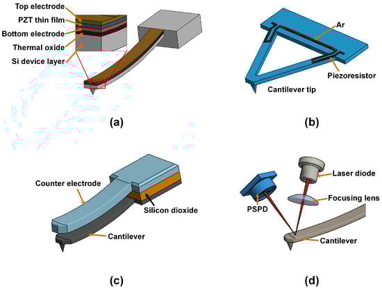 Schematics of (a) piezoelectric (adapted from [144]), (b) piezoresistive, (c) capacitive (adapted from [145]), and (d) optical lever microcantilever deflection detection systems [133].