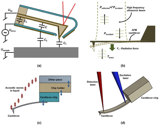 (a) A cross section showing the encased cantilever for electrostatic excitation. The capacitance , , and are parasitic capacitances whereas C is used for actuation [174], (b) acoustic radiation pressure excitation, (c) piezo-acoustic, and (d) photothermal excitation methods.