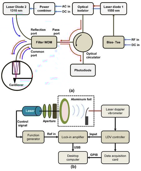 Miyahara and his co-workers [187] have proposed a new method for exciting a microcantilever sensor by combining two laser in a single-mode optical fiber using a filter wavelength division multiplexer (FWDM) to achieve both excitation and detection. With the set-up it was possible to eliminate the spurious mechanical resonances associated with the piezo-acoustic excitation method (see Figure 8a). The interference of the returning light from the back of the cantilever and the fiber end goes back to the FWDM that helps to block the reflected excitation laser signal and only allows the detection laser to pass to the photodetector through an optical circulator. Modulation was achieved by modulating the drive current with a power combiner. This method allows an easy modification to the existing AFMs that use the fiber-optic interferometers for detecting the microcantilevers.