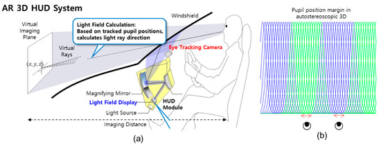 Autostereoscopic three-dimensional (3D) displays provide immersive visual experiences with a realistic sense of the image depth without the need for 3D eyeglasses [1,2]. Although multiview autostereoscopic 3D displays can be observed without 3D eyeglasses, they suffer from limited 3D viewing zones and decreased image resolution, owing to the number of 3D views [1,2]. The eye tracking-based autostereoscopic 3D method overcomes these limitations, allows a single-user, seamless 3D experience, and provides higher 3D resolution contents. Several consumer applications for a single user can utilize this technique, such as mobile devices, personal monitors, and game consoles. One of the commercial eye tracking-based 3D display products is the Nintendo 3DS. Additionally, our 10.1” tablet and 31.5” personal monitor prototypes that use the eye tracking-based directional subpixel rendering algorithm are described in [2,3]. Additionally, this eye tracking-based autostereoscopic 3D method can also be utilized in head-up displays (HUDs) (Figure 1a), which have been increasingly used by the automotive industry. Visual contents are shown directly in the line-of-sight via combiners or windshields. While two-dimensional (2D) HUD shows augmented reality (AR) information in a 2D virtual plane that causes additional distraction and visual mismatches, AR 3D HUD can overlap 3D visual information directly on the street or road objects following the adjustment of the 3D depth [4,5]. The real-time eye tracking system can work on various consumer electronics platforms; it is not limited to autostereoscopic 3D display systems including 3D HUD as described. The eye tracking method can be adopted in various consumer electronics, such as driver monitors in automobiles [6,7], augmented and virtual reality [8], smartphones, gaming devices, and televisions [9]. In particular, for driver monitoring systems in automobiles, the eye tracking method can capture the driver’s state by checking the speed of pupil movement and head pose estimation from face normal direction. These can be utilized as indicators of drivers’ attention levels. Further, smartphones and digital cameras can use the eye tracking method for autofocus on human eyes rather than whole faces [10]. Additionally, when the eye-position-tracking method is extended to gaze-tracking techniques when combined with eye glints information, its application extends to a variety of human–machine interactions [11,12,13].