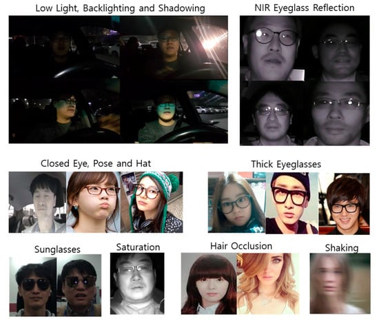 One of the main advances compared with previously published works is that our method was content-aware, whereby different eye trackers were applied according to the image conditions, such as normal, bright, dark, low-light cases, and cases with thick eyeglasses and eyeglass sunlight reflection (Figure 10). Specifically, low-light conditions can be handled with NIR LED control and with the NIR image DB-based eye tracker. Additionally, compared with previous methods that detected faces or eye–nose regions, our proposed detection utilized the novel EBL approach. The EBL method typically trains only a small fraction (less than 5%) of the detection training image DBs in much shorter training times, while improving the detection rate through three stages.
