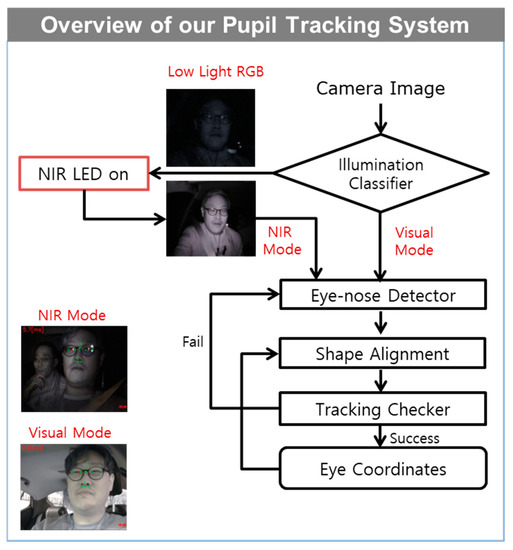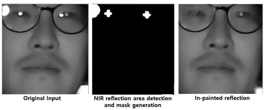 The overall flowchart of the proposed system and algorithm is shown in Figure 3. One of the noticeable challenging problems that degrade the performance of the eye tracking system is low lighting. Given that most of the high-speed camera sensors do not properly capture images in low-light conditions with a high speed (need at least 60 fps for latency issues), the authors utilized an NIR camera (with active LED lighting), which was turned on when the visual image quality was extremely poor in low-light conditions. Illumination classification was performed to switch the visual/IR camera. Herein, the authors removed the R cut filter, and only a single camera was operated for both the visual and NIR modes of operation. Basic components, as discussed in Section 2, that is, the eye–nose detector, eye–nose alignment, and pupil tracking, were designed for each modality with corresponding quality measures to handle a wide range of real-world image conditions. For each modality, image content-based tracking modules were operated. In other words, by using the visual aligner and the NIR aligner in Figure 6, our eye tracking system could overcome a wide range of image/illumination/user conditions by switching between the visual/NIR modes in a smart manner. Specifically, an in-painting algorithm was applied on an eyeglass reflection area of the NIR DB images for both training and testing as a preprocessing stage for the aligners [32]. Because our eye-alignment algorithm utilized pixel gradient information, the authors in-painted the reflection area in a way that minimized the edges from NIR reflections (Figure 8). This was a necessary step used to improve robustness in the instances at which eyeglasses were present in NIR conditions. It is worth mentioning that the use of the eye–nose region in Section 2 focused more on pupil center alignments, and thus, prevented pupil centers from erroneous alignments, which were less affected by the alignment of other parts of the face in various illumination conditions.