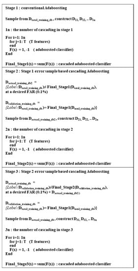 Suppose the existence of the entire training DB is composed of positive samples, the actual used training DB, and the validation DB in the form of Dtotal_training_DB, Dactual_training_DB, and Dvalidation_DB, respectively. Let the corresponding numbers of these databases be Ntotal_tranining_DB, Nactual_training_DB, and Nvalidation_DB, and the number of positive samples and negative samples be denoted by Npositive_training_DB, Nnegative_training_DB, whereby Nnegative_training_DB >> Ntotal_training_DB. The procedures used for training EBL can be explained in Figure 5.