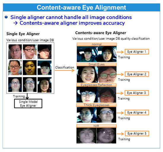 Because SDM, which is a regression-based method, solves the shape alignment problem as a general optimization problem, the single SDM aligner cannot be easily optimized globally on the training image DB in various conditions. To handle this problem, the authors propose a content-aware eye–nose shape alignment method. The proposed method is content-aware in the sense that different SDM aligners are applied according to the image content categories. Content classification was performed on the twice enlarged eye–nose region obtained from eye–nose alignment in the previous camera frame, and each of the DB performed its own SDM aligner model training and testing. Based on the image quality and condition, such as bright or dark images, NIR images, eyeglass reflections, use of thick eyeglasses, etc., corresponding aligners were applied. This step is illustrated in Figure 6. Unlike EBL-based detector model training, each content-aware SDM aligner trains the content of each image dataset without utilizing error samples, based only on error-free samples to achieve better representation of the image content characteristics.