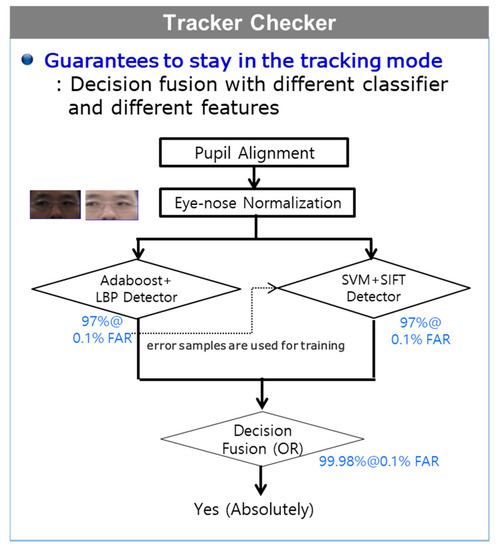 Our proposed tracker checker consisted of SIFT features and support vector machine (SVM) classifiers [28], along with the LBP-based eye detector that was used in the eye detector under the EBL framework. With the use of two different feature spaces, such as SIFT and LBP, and with the use of two different classification schemes, such as a set of weak classifiers (Adaboost) and a strong classifier (SVM), our designed tracker checker is guaranteed to be maintained active as long as the aligned results contain the two pupils (Figure 7). Therefore, most of the time during which the user is present in front of our eye tracking system, the tracker checker tries to maintain the tracking mode instead of the detection mode.