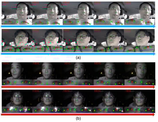 Seamless pupil tracking while driving outside with normal red–green–blue (RGB) (a) and NIR (b) cameras. The eye tracking speeds are shown at the left upper positions of each frame image such as 4.7 [ms].