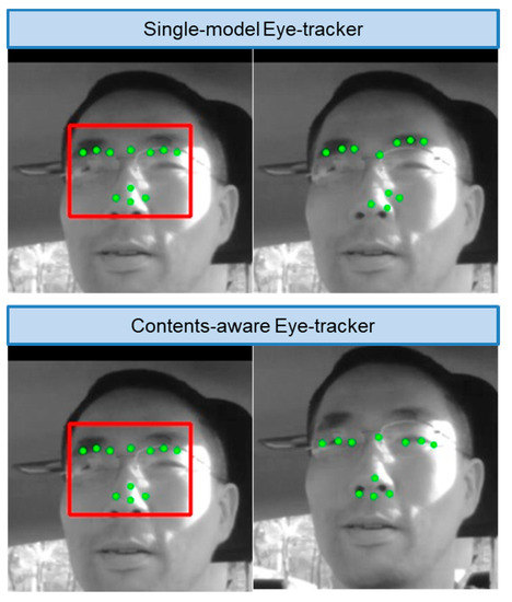 Single-model eye-tracker versus the proposed content-aware eye-tracker on one of the challenging cases that related to eyeglass reflection based on sunlight. The initial shape points inside the detector box (left) are regressed to optimal shape points by the content-designated, SDM-trained aligner (right). Compared with the conventional single-model eye-tracker, the proposed content-aware eye-tracker successfully aligned the correct eye positions.