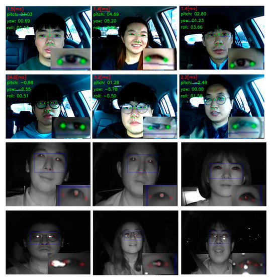 Additional results at various driving conditions: RGB mode at daytime (1st and 2nd rows) and NIR mode at nighttime (3rd and 4th rows). Especially, the 1st and 2nd rows show head pose estimation results from our 11 point eye tracking algorithm.