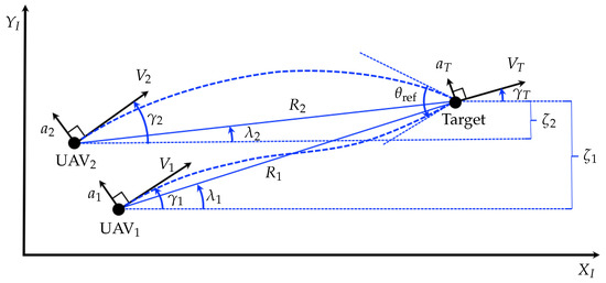 Let us consider the planar homing guidance geometry of two UAVs and a stationary (or slowly moving) target, as shown in Figure 1. The frame is an inertial Cartesian coordinate system which is fixed in space. Variables associated with the i-th UAV for and the target are denoted by subscripts i and T. Here and denote the velocity, flight-path angle and the line-of-sight (LOS) angle, respectively. The normal acceleration of each vehicle is denoted by a and the predetermined relative approach angle constraint of two UAVs are denoted by . The relative distance of each UAV and target in axis is denoted by . Other variables in Figure 1 are self-explanatory.
