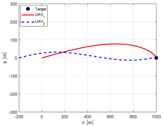 In this example, two UAVs are launched from different locations with identical launch angle of 10 deg and guided to approach a stationary target with different approach angles separated by 30 deg. Please note that no explicit approach angle command for each UAV was given. For each UAV, the maximum available guidance command is assumed to be , where g represents the gravitational acceleration. The initial states of the UAVs and the target are listed in Table 1.