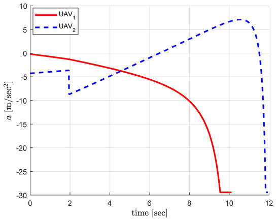 Figure 4 shows the acceleration commands during the engagement. The guidance command for UAV1 decreases to negative value which allows UAV1 to approach the target from above to satisfy the relative angle constraint. The guidance command for UAV2 increases from negative value to positive to approach the target from below to satisfy the relative approach angle constraint. Please note that UAV2 is guided with the PN guidance law for the first 1.95 s where the matched time-to-go for UAV1 does not exist in this engagement scenario. After that UAV2 cooperates with UAV1 for the matched time-horizon.