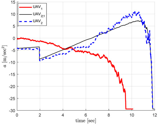 Figure 6 shows the acceleration commands during the engagement where the thin black line (UAV2|1) represents UAV1’s best estimate on UAV2’s guidance command. UAV2’s guidance command is maintained slightly less than that of UAV2|1 until UAV2’s correction command increases sufficiently, and become greater than the estimated value in order to making up the perturbed trajectories caused by the disturbance. It is obvious that the guidance command of UAV2 converges to that of UAV2|1 at the terminal time which indicates that the correction command converges to zero.