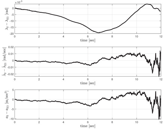 Figure 7 shows the error in UAV1’s estimate on UAV2’s line-of-sight angle and the line-of-sight rate. The last plot in Figure 7 shows the corresponding correction command computed by UAV2. The estimation errors increase under the influence of the disturbance, but they quickly converge to zero, which indicates the decentralized guidance strategy tries to follow the centralized guidance strategy. Please note that the fluctuating guidance commands observed when the time-to-go approaches to zero is usual as in most of the classical and practical guidance laws [1,3,16,17,35,37].