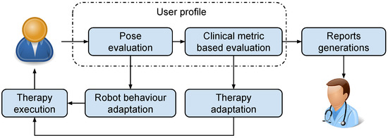 Since each patient has specific requirements, the robotic architecture must tailor to each of them, developing a personalised therapy focused on the movements affected by the disease. This makes it necessary to generate a user profile model for each patient containing a full description of his/her condition, allowing for generating personalised therapy plans. Moreover, this user profile model must be capable of being modified in the course of the therapy, since the patient’s requirements can change. This profiling process is also performed in classical therapies, where patients are evaluated by means of clinical metrics, allowing for evaluating the improvement session by session. Another key benefit of the use of clinical metrics is that they provide a useful mechanism to share the information among specialists.