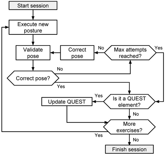 The adaptive threshold takes values from to . Both values have been determined experimentally by the therapists. The minimum represents the strictest value to be compared with the , so a more accurate imitation is needed, while the maximum is the most permissive. In every session, is initialised to and is updated after evaluating the success of the patient along each pose. The system gives three attempts to perform correctly a pose, otherwise it is skipped. In this case, is increased a 2% (an increment fixed with the help of the therapist). The reason for this low value lies in the strong effect of the threshold when evaluating every posture. In contrast, when the patient performs correctly a pose in the first attempt, the threshold is decreased by 2%. Both cases respect the limits of . This explains how the system behaves being more permissive or not according to the performance and success of the patient during the session.