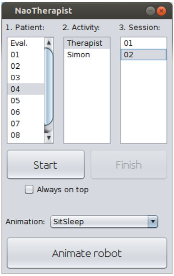 The interface allows the therapist to choose the patient, the activity to perform (as mentioned above, a regular therapy or the Simon game) and the particular session of the long-term therapy to execute. In addition, a button allows the therapist to send some simple orders and animations to the robot, as for example to greet the patient.