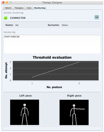 The monitoring interface (All patients’ names have been replaced by fictitious names) (Figure 6) shows different sections providing information about the patient and the performance in the session currently being executed. This includes, from top to bottom: (a) a console with a detailed step by step information of the actions the robot is carrying out, (b) a graph showing the evolution of a threshold parameter, and (c) a picture of the pose in each limb currently asked the patient to perform. The threshold parameter , which is recalculated after each attempt of the patient to perform a pose, is used to adapt the architecture to the patient’s performance and to evaluate the performance over the session. In a typical session with a therapist, he/she will consider as correct certain poses even though there are differences with the requested pose. Similarly, the NAOTherapist architectures also feature flexibility when evaluating a pose. This threshold parameter defines how strict the evaluation of the correctness of a pose is; when it increases, the requirements to consider a pose as correct are relaxed, thus accepting postures that are farther away from the required ones. In contrast, decreases when the differences between the pose shown by the robot and the one imitated by the patient and minimal. This allows the system to stay updated on the patient’s current condition, to his limitations and to the difficulties experiment during the session. The threshold is present throughout the whole development of a therapy session. Its dynamic adjustment allows for considering the difficulty of every particular exercise by relaxing or by restricting the requirements to consider a pose as correct according to the patient’s performance. Moreover, it affects both limbs simultaneously, since the architecture defines sequences of poses, involving a particular position for each limb at the same time. Nevertheless, the vision system allows for evaluating both limbs individually.