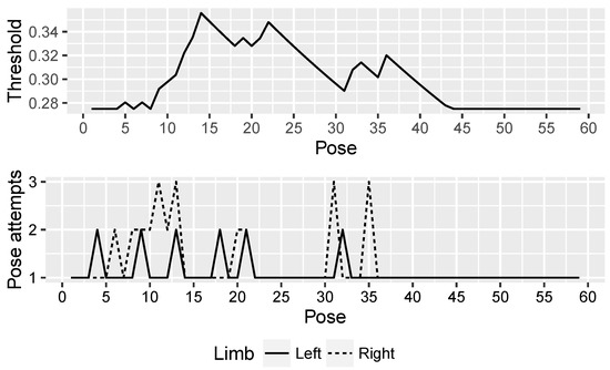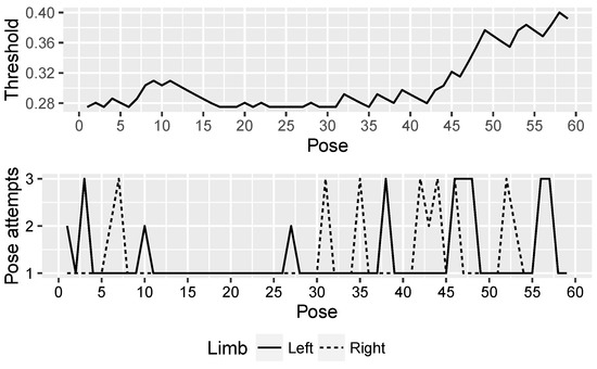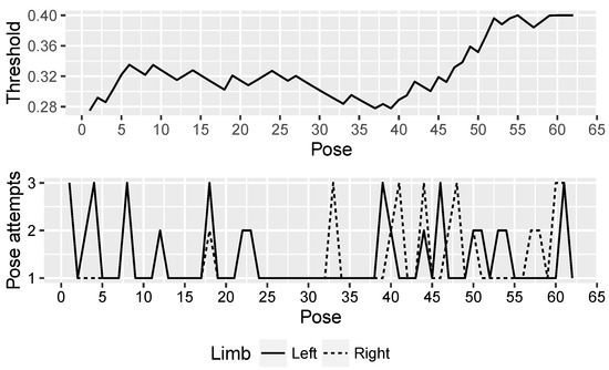 As it can be seen in the three figures, the adaptive threshold progresses differently. For example, patient P1 (Figure 7) had bigger difficulties in performing the first movements, while at the end of the session executed each pose successfully on the first attempt. In contrast, patient P3 (Figure 9) experienced difficulties throughout the whole session with the exception of some poses in the middle of the session, where the threshold value decreases consistently. Finally, patient P2 (Figure 8) found the most complex part of the session in the last movements. The evolution of the adaptive threshold parameter can be used to be remotely aware of the development of the session, by merely looking at its evolution in the plot included in the monitoring screen.