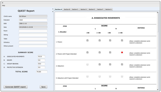 The system is able to calculate four items (as shown in Figure 10) belonging to the first section of QUEST, which is focused on Dissociated Movements. The reasons for which only a subset of elements has been evaluated rely on the limitations of the Kinect sensor used, which does not allow for precisely monitoring small movements as those realised by the fingers. Our objective has been to develop an easily extensible architecture, so that, in the future, it will be possible to employ a more sophisticated sensor, allowing for filling more elements in the QUEST report.