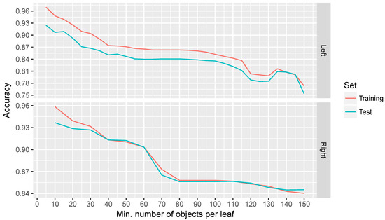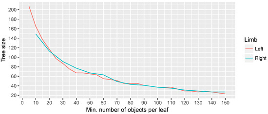 The results, in terms of accuracy and minimum number of objects per leaf for both limbs, are shown in Figure 12, while, in Figure 13, the evolution of the size of three is presented. In the first figure, it can be seen that there is a clear trend where the accuracy is affected by an increase in the minimum number of objects per leaf, while the size of the tree increases as expected. We consider that a minimum of 30 objects per leaf is a good compromise between the accuracy and the size of the tree. When defining a higher minimum number of objects per leaf, one can appreciate that some erratic behaviours arise.