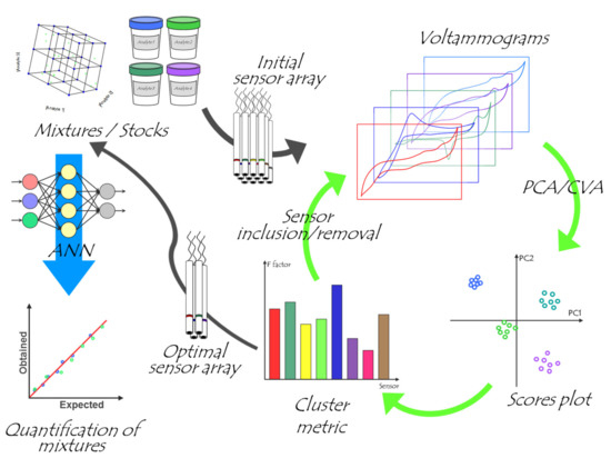 Despite its importance, most of the papers dealing with ETs focus on the developed application itself or the data treatment stage, but very few report on the choice of the sensors. The challenge here arises on the a priori selection of the best combination of sensors that can carry out the desired qualitative or quantitative task given the difficulty to assess the cross-reactivity shown between them and the impact that this will have in the final model. In this direction, one common approach that has been taken in the case of potentiometric sensors is the inclusion of at least one or two ion-selective sensors (ISEs) towards the compounds of interest plus some generic ones; however, this does not guarantee that the optimal array is selected [1]. Another approach would be the complete sensor characterization, which consists in carrying out the multi-analyte calibration, from which the surface response plots are built and the binary selectivity coefficients are calculated (e.g., Reference [4]). However, this is a tedious task even for the two-analyte case, and it does become not feasible for more complex mixtures as it may require hundreds of samples. Furthermore, such a task becomes even more complex when, e.g., voltammetric sensors are used instead of potentiometric ones due to the higher complexity and dimensionality of its response. Alternatively, another approach that has been employed is the use of feature selection methods upon measurement of all the samples, and to carry out the a posteriori removal of the variables and/or sensors that do contribute less to the classification or quantification task (e.g., usage of genetic algorithms or other pruning methods [5]). Although this approach does probably provide the best outcome possible, it is also more tedious and requires instruments capable of simultaneously measuring a large number of channels.