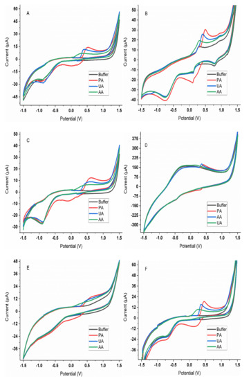 Upon selection of the optimal sensor array for the analysis of paracetamol, ascorbic acid, and uric acid, the next step was to evaluate the performance of such an array to achieve the simultaneous determination of their mixtures. To this aim, the set of samples described in Section 2.3 were measured under the same conditions as in previous experiments, recording a complete cyclic voltammogram for each of the electrodes (Figure 5). As could be expected from Figure 2, although a different voltammetric response is obtained for each of the considered compounds individually, there is a clear overlap when mixtures of those are analyzed simultaneously. Therefore, not being possible to achieve its quantification via univariate regression, requiring the aid of chemometric models; an approach that is possible thanks to the cross-response shown by the selected sensors, i.e., the different sensitivity shown by each of the electrodes towards each of the compounds (Table 1). This is a desirable condition for the proper performance of any multisensory array analysis system.
