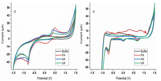 Voltammograms obtained for the three APIs (250 µM in phosphate buffer) using the GECs modified with (A) SnO2, (B) Prussian Blue, (C) ZnO, (D) PPy, (E) CoPc, (F) TiO2 and (G) Bi2O3, and (H) the metallic Pt electrode.