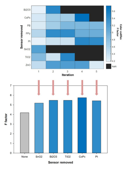 To objectively carry out the selection of the final sensor array for the quantitative task, the next step was the compression of the data with DWT and its analysis by means of PCA and CVA. Firstly, the 2D score plots were obtained, and from those the F factor was calculated. This process was done with the 8-sensor array and repeated by removing one sensor at a time, similar to what could be considered a leave-one-out process, but from the sensors’ side (Figure 1). Next, the F values for each of the iterations were compared, and the sensor that when excluded led to the higher increase of the F index was then discarded. This process was repeated, reducing one-by-one the selected sensors, until the F value decayed (Figure 3).