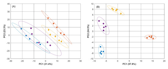 For the selection of the optimal sensor array, data was submitted to PCA and CVA, and the clustering observed was evaluated by means of the F factor [29,30,31]. The F factor is defined as the ratio of variances between different clusters and the sum of internal variance in all clusters (Equation (1)). It can be used as a standard procedure to measure the capability of a particular sensor to discriminate between different classes of samples in ET applications. Since the F factor compares the variability between classes to variation within classes, with increasing F values the discrimination between different classes becomes easier.