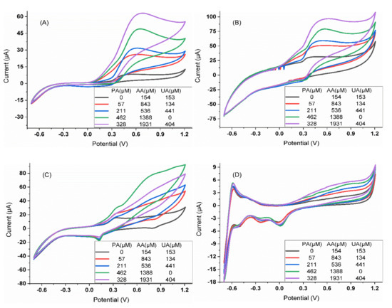 Representative voltammograms obtained for certain arbitrary mixtures of the different APIs (the concentration for each compound is indicated in the legend) with the four-sensor selected array: GECs modified with (A) ZnO, (B) PPy and (C) Prussian Blue, and (D) the metallic Pt electrode.