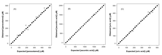 In order to demonstrate and illustrate such a procedure, the simultaneous quantification of paracetamol (PA), ascorbic acid (AA), and uric acid (UA) mixtures was chosen as the study case. These mixtures correspond to a common case in the pharmaceutical field where the determination of paracetamol in the presence of ascorbic acid is attempted. The latter is usually present as an excipient, whereas the inclusion of uric acid is motivated as some studies suggest that ascorbic acid intake is related to uric acid concentration in serum [9,10]. This particular case was chosen as this mixture has already been previously analyzed in our laboratories employing different sensors arrays, thus providing us with guidance on which performance could be expected and whether previous results could be improved or not by tailoring the electrode choice to particular cases.