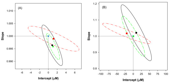In this direction, to ensure that the former are statistically within the confidence intervals of the calculated regression parameters, the joint confidence intervals were calculated and plotted (Figure 7), as this allows to rapidly detect whether there are or not differences between the actual and predicted values at a certain significance level, judging simultaneously the goodness of slope and intercept [33]. In this case, the ideal point (1,0) is within the ellipsoidal confidence intervals for the three species, both for the training and testing subset, which allows us to state that there are no significant differences between the actual concentration and the values predicted by the model.