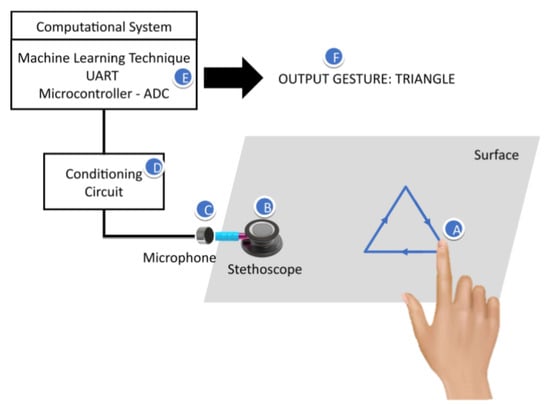 Figure 1 illustrates the operation of the proposed system. When a nail (A) scratches a surface, it produces a series of mechanical vibrations, which propagate through the surface and they are acquired by the microphone (C), which is connected to the stethoscope cannula (B). The use of stethoscopes to acquire sounds naturally provides a high level of suppression of environmental noise. The microphone converts the sound into an electrical signal. By covering the microphone with the stethoscope, the first may pick up a less noisy signal from the environment. This allows for impacts to be promptly segmented from any background noise with a simple amplitude threshold [15]. The microphone signal is then filtered and amplified by a conditioning circuit (D), and acquired by an analog to digital converter of a microcontroller. Then the microcontroller sends the digital signal via serial communication (UART) to the computer (E), which finally will be capable of recognizing the gesture performed (F) on the surface by one of the machine learning applications developed in MATLAB.