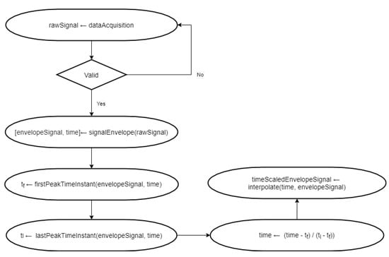 Finally, we have time scaled the envelope signal employing the algorithm developed in this work and presented in Figure 5. In this data set, we first identify the initial touch, when considering that there is a peak every time the finger touches the surface, and we shift this data set to time 0 (zero). We identify the last touch, and we time scale the data set to the time interval [0, 1], with 100 samples in between. Thus, the instant that the user begins to draw is no longer relevant. The second improvement was making the algorithm robust to the drawing speed, because users have different rhythms. We used time scaling to maintain the time scale of the data across different datasets.