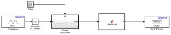 The first step is the installation of the hardware support package in Simulink. Second, develop the model, as shown in Figure 9. In this model, the Analog input acquires the raw signal. If the signal value is greater than 60, which means that someone is drawing on the surface, the Compare To Constant block applies a True value into the import In1 of the Enable Subsystem block, which has a memory block saving the raw signal during three seconds. The raw signal is then fed into the hidden Markov model previously generated through the MATLAB HMMModel function. Finally, the gesture recognition result (circle, triangle, or square) is printed on the serial output by the Serial Transmit block.