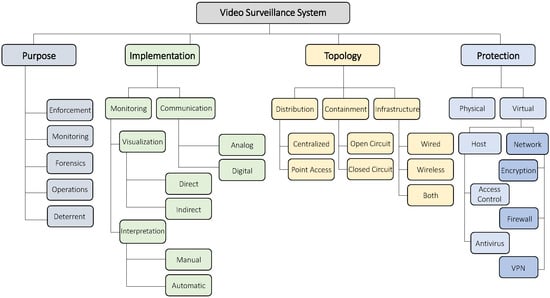 To get a better understanding of IP-based video surveillance systems, in Figure 1, we present a taxonomy of their concepts. In general, a system can be described in terms of its purpose, implementation, topology, and protection. We will now detail each of these aspects. To create it, we started with a basic taxonomy which is based on common knowledge and our experience in cyber security. We then evolved the taxonomy based on input from surveillance system engineers, security experts, and the papers, vulnerability disclosures, and reports which we reviewed. We verified that the information could be mapped to our taxonomy, and, if not, we updated it.
