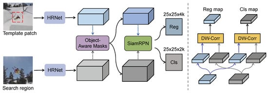 To strike a balance between accuracy and speed, Siamese networks-based trackers [,,,] have developed into a promising solution. Due to the simple, neat and effective offline training strategy, these approaches which formulate tracking as a template matching problem have attracted wide attention in visual tracking community. Specifically, Siamese-based trackers [,] are aimed to learn a general similarity function via cross-correlation for an exemplar patch and the candidate patches, and perform tracking without any fine-tuning or online update process. To abandon original time-consuming multi-scale testing and guarantee tracking accuracy, SiamRPN [] introduces a region proposal network [] into the classic Siamese networks. DaSiamRPN [] further improves the training strategy and enhances the discriminability of SiamRPN, obtaining state-of-the-art results on VOT challenges. To exploit more effective feature extractors, SiamRPN++ [] successfully apply the modern networks [,] as backbone network to replace the shallow AlextNet []. These indicate that the performance of Siamese-based methods is highly reliant on the feature representation.