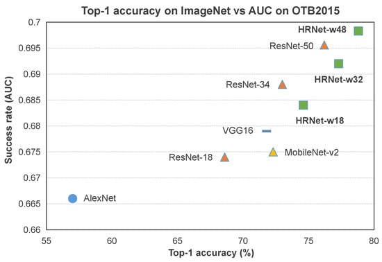 The Top-1 accuracy on ImageNet vs. the Area-Under-Curve (AUC) score on OTB-2015 [].