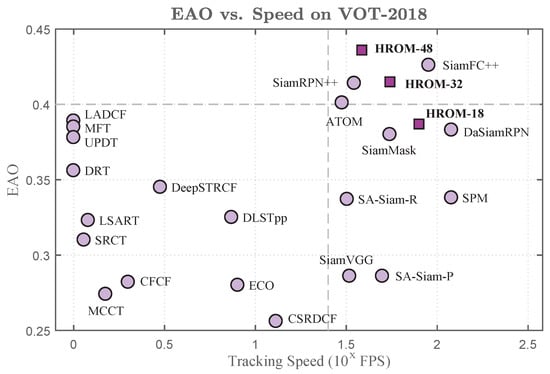 Furthermore, we compared the Expected Average Overlap (EAO) and the Frame-Per-Second (FPS) of state-of-the-art tracking methods on VOT-2018. Figure 5 shows the detailed comparisons. Please note that the tracking speed axis is in a log scale, and the gray dashed lines indicates the boundary. We can observe that HROM-48 achieves the best EAO score with a real-time tracking speed (40 fps). Two variants, which replace HRNet-w48 backbone with HRNet-w32 (HROM-32) and HRNet-w18 (HROM-18), respectively. HROM-32 obtains a competitive performance with SiamRPN++, and runs about 52 fps, while HROM-18 outperforms SiamMask [] with a faster speed (78 fps).