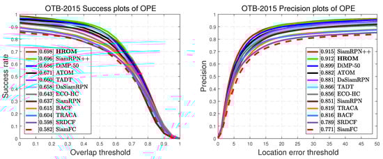 We compared HROM with 11 recent state-of-the-art tracking algorithms including DiMP-50 [], SiamRPN++ [], ATOM [], TADT [], DaSiamRPN [], TRACA [], ECO-HC [], SiamRPN [], BACF [], SiamFC [] and SRDCF []. Figure 6 reports both success and precision plots of these methods using OPE. Compared to SiamRPN++ [], the proposed tracker obtains almost a similar performance with an AUC score of 0.698 and a distance precision rate of 0.912 at a more efficient design. Moreover, HROM outperforms recent leading tracker DiMP-50 [] with relative gains of 1.2% and 1.3% for AUC and precision. HROM yields 3.8% gain in AUC of success plot than TADT. Both TADT [] and our model explore the object-aware features, but the online learning of TADT hinders the generalization. In addition, compared to real-time correlation filter-based tracker ECO-HC [], our method achieves 5.5% and 5.6% improvements in terms of success and precision, respectively. This shows that the proposed approach can perform effective and efficient online tracking.