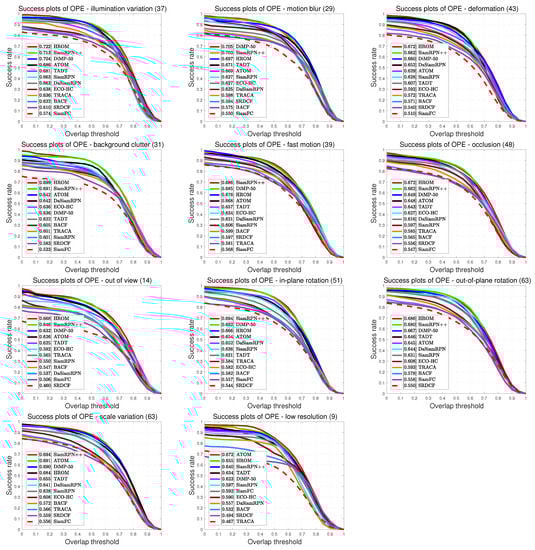 Success plots of different trackers with 11 attributes on the OTB-2015 benchmark.