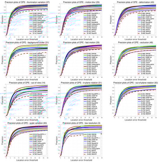 Precision plots of different trackers with 11 attributes on the OTB-2015 benchmark.