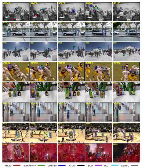 As shown in Figure 10, we conduct the qualitative evaluation of 7 state-of-the-art trackers containing our HROM, SiamRPN++ [], DiMP-50 [], ATOM [], ECO [], TADT [] and SiamFC [] over several challenging sequences (from top to down: Freeman4, David3, Skiing, Football1, Liquor, Walking2, Basketball and Soccer) from OTB-2015 tracking benchmark [].
