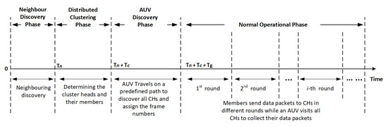 CLMD includes four phases to operate: neighbor discovery, distributed clustering, AUV discovery, and normal operational phase, as illustrated in Figure 1. The beginning time of each phase has been set for all sensors in order to start and end together. A guard time has also been applied to avoid the effect of clock drafts that may occur over a long period of time.