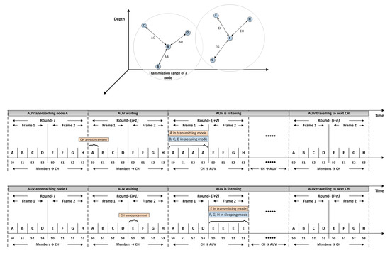 After obtaining the frame and slot information from the initial two phases, each sensor knows its operational times as well as neighboring transmitting times. Each round repeats this pattern until further changes are required by the central scheduler due to energy depletion of CHs, or topology changes as sensors may move with the water current (if they are not anchored). Thus, the operational phase length depends on the number of rounds before rescheduling.