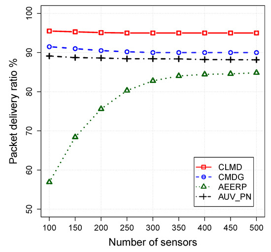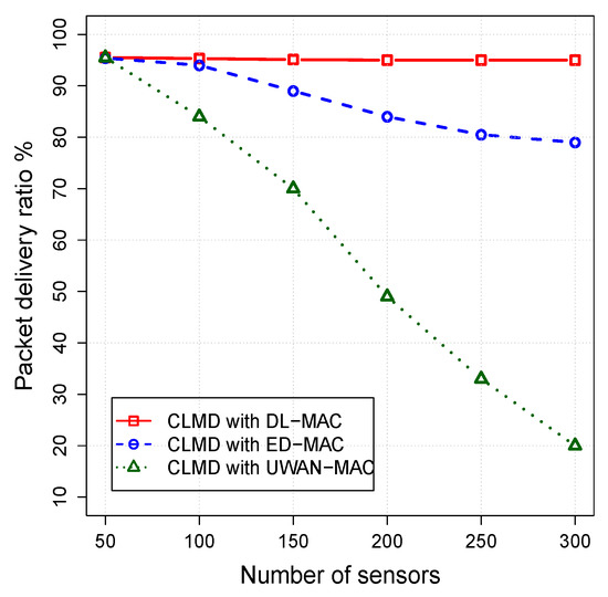 In this set of simulation scenarios, the impact of sensor density on the performance of CLMD with DL-MAC, CLMD with ED-MAC, and CLMD with UWAN-MAC are examined. The number of sensors varies from 50 to 300, while other parameters are fixed. The simulation results for the packet delivery ratio, energy per packet, and network lifetime are shown in Figure 7, Figure 8 and Figure 9, respectively.