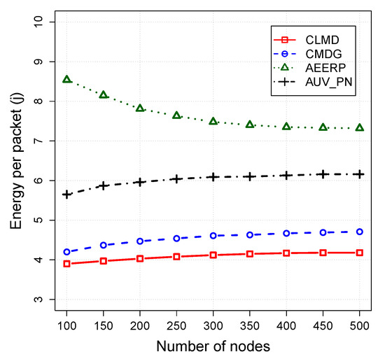 The packet delivery ratio for various network densities has been shown in Figure 4. CLMD has delivered a higher number of data packets to the destination compared to other similar schemes because of using a cross-layer design to limit the number of collisions. However, CMDG only uses a CSMA MAC protocol which is not optimal to be used in such a complex network. In the case of AUV_PN, no relay hop bound is considered to limit the number of hops between the CH and its members while it increases the chance of packet failure by transferring the packets over a longer distance. On the other hand, in AEERP, the chance of void occurrence between CH and its member increases when the network is sparse. Thus, in sparse scenarios, AEERP suffers from the lowest packet delivery ratio.