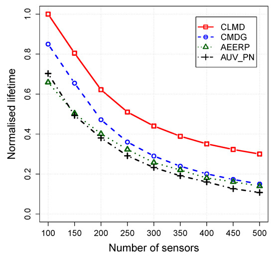 The network lifetime of the proposed schemes has been shown in Figure 6. CLMD has higher network lifetime because of assigning sensors to a higher number of CHs in a uniform way, and the packet retransmission is highly reduced by utilizing an efficient MAC protocol. In CMDG, the network lifetime is higher than CLMD because of higher number of packet retransmissions due to using a CSMA MAC protocol. AUV_PN has a lower number of clusters which reduces the network lifetime. There is also no uniform assignment to the CHs in AEERP which can result in a shorter lifetime.