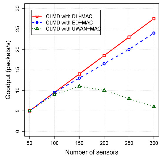 As shown in Figure 8, the network goodput of all protocols is proportional to the nodes density. When the number of nodes is low (with 50 nodes), the network goodput increases correspondingly, except CLMD with UWAN-MAC, which reaches a saturation point within 150 nodes. Our proposed protocol, CLMD with DL-MAC, achieves a higher network goodput than that of CLMD with ED-MAC and CLMD with UWAN-MAC when their nodes density are the same. This is mainly because of that the higher the number of subframes in CLMD with DL-MAC, the more available slots can be settled as the nodes density increases. This means that CLMD with DL-MAC has the ability to handle more packets by having more slots to the sensors.