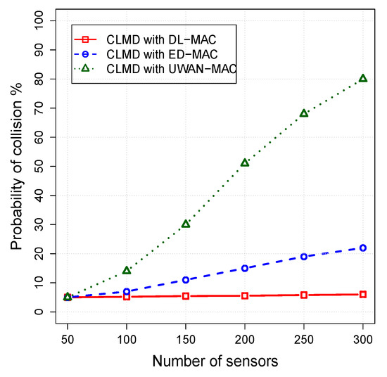 In Figure 9, we can observe that the higher the density of nodes, the higher the probability of collision which are presented to reserving the channel, except CLMD with DL-MAC protocol. Our proposed protocol (CLMD with DL-MAC) is more efficient than other protocols by having less percentage of packets lost when the density of nodes increases. This is due to the MAC protocol that is used in our proposed protocol, which is efficiently able to schedule the nodes by dividing the network area into a multi-layer to avoid any possible vertical collisions among the sensor nodes located in adjacent layers. Subsequently, each layer has k subframes to be settled by cluster heads located in the two-way distance from each other to avoid any potential horizontal conflict. By having a higher k subframe configurations with a fixed traffic rate, our proposed protocol is efficiently able to handle more nodes. However, the CLMD with UWAN-MAC begins to lose a small number of packets when the number of nodes is 50. When the number of nodes increases, the percentage of packets lost of CLMD with UWAN-MAC is significantly increased by losing approximately 80% of the total packets when the number of nodes is 300. This is mainly because of its inefficient scheduling, which significantly leads to overhearing and more collisions.